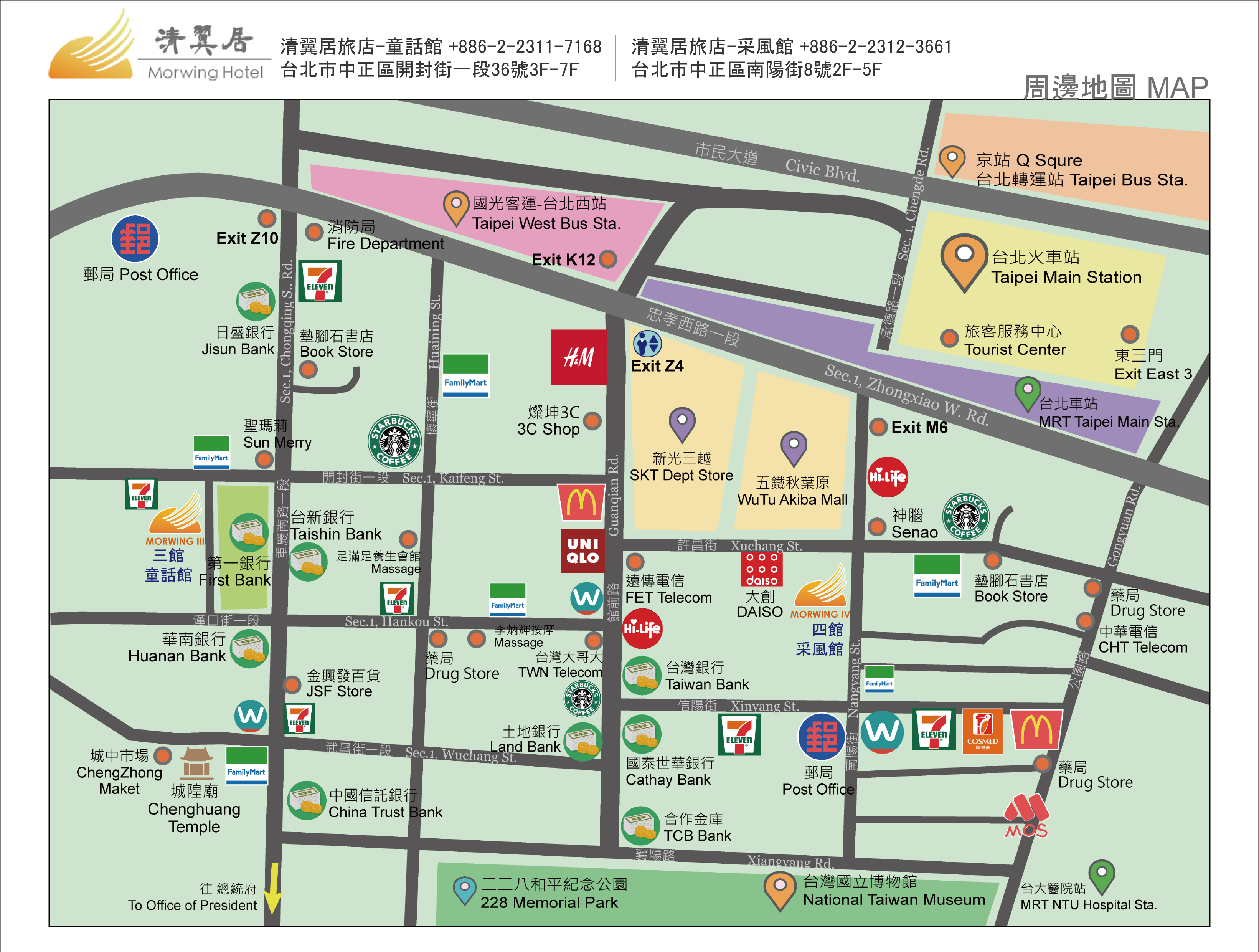 如在台北車站附近迷路,建議直接問司機或路人新光三越方向後,新光三越正門右手邊會看到H&M 和麥當勞,往麥當勞的方向直走兩個路口後,會看到綠色建築物"華南排骨"左轉進巷口就可看到我們旅店的大門。